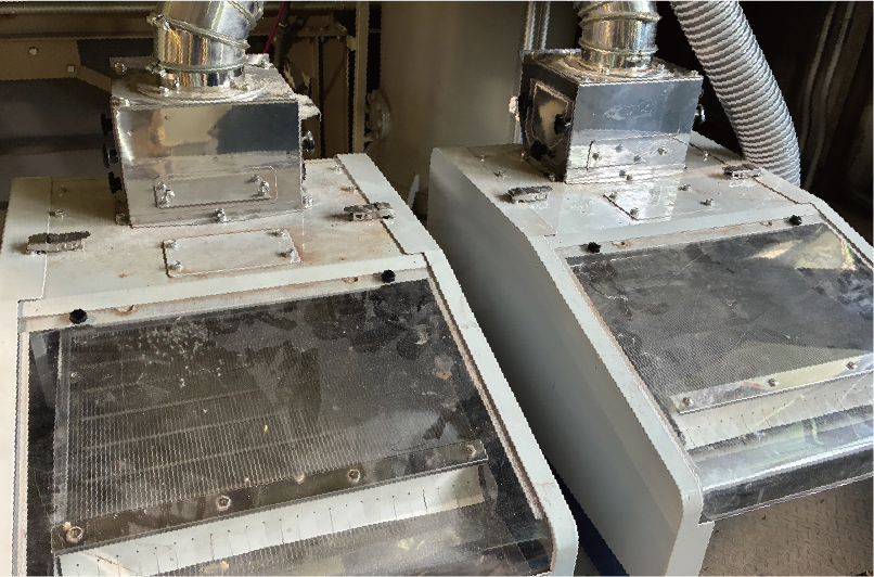 玄米をタンクへ張り込んだ後、粗選機で玄米に混ざっているゴミ、木片、もみ殻などを除去し、計量機を経て、石抜き機で石やゴミを除去します。これから精米する玄米の大きなゴミを取り除く工程です。