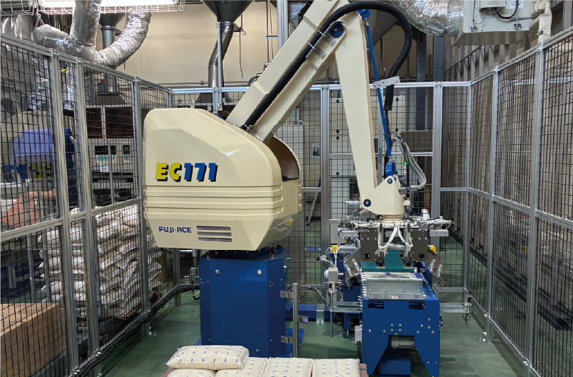 精選工程より送られてきたお米を製品タンクに貯蔵し、シフターで再度ふるいにかけて米の大きさを選別します。その後自動計量包装機で包装し、重量と金属検査の最終検品後、自動でパレットに積み上げ出荷場へ送られます。